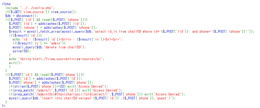 우리는 lv의 값을 admin으로 변경해야하기 때문에 insert문을 insert into chall59 values('{$_POST['id']}',{$_POST['phone']},'admin')으로 바꿔줘야 한다.